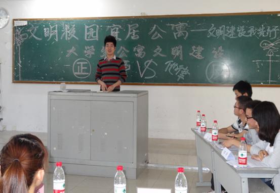为了给大学生张扬个性,展示才能提供平台并营造具有浓厚文明气息的公寓氛围,2013年4月14日下午16时至18时,由管理学院北二楼管会、党员服务站在博智楼402教室联合举行了辩论赛。