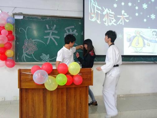 在讲座过程中,同学们不仅认真听着并做好笔记。在互动环节,还有不少同学积极参与到活动中,向嘉宾咨询常见疾病的防治。本次讲座除了让大家关爱健康外,还有教给大家安全方面的知识!跆拳道协会教练教给大家的校园安全防身术,让所有同学都活跃起来,现场气氛为之高涨。
