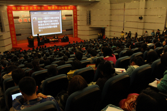 开幕式结束后,张静涛先生以“让梦想起飞”为主题作创业教育知识讲座。张静涛先生睿智而幽默的演讲赢得了现场五十多次雷鸣般的掌声,报告厅气氛异常热烈。互动环节中,同学们就“遇到困难如何克服,如何鞭策自己”等问题与张静涛先生进行了互动交流。