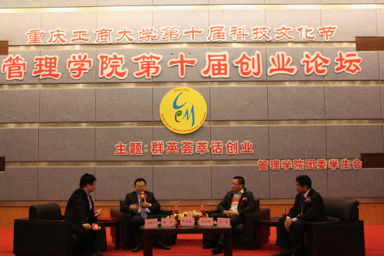 11月14日晚,第十届创业论坛开幕式在博智楼7200学术报告厅隆重举行。校长杨继瑞、校党委副书记朱伯兰以及学校相关职能部门负责人、香港中青国际教育集团高层、管理学院全体党政领导出席了开幕式。本届开幕式邀请到香港中青国际教育集团董事长张静涛先生为重庆工商大学学子支创业之招。光明日报、重庆新闻广播、重庆商报、大渝网、华龙网等多家媒体来到现场报道此次活动。