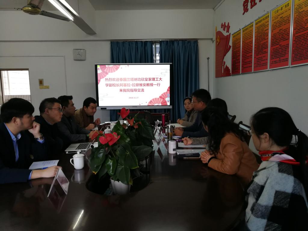 月27日,泰国兰塔纳功欣皇家理工大学行政副校长阿基拉·拉察维安教授、国际学院院长那他鹏·朱迪卡思拉博士、校长助理他纳察·特彼塔先生、国际学院副院长唐长江博士、学院管理委员蒲瑞辉等领导和老师一行5人至管理学院访问,与我院商谈教学及科研合作事宜,我院杨柏院长、周莉副院长、国际项目部黄洁博士及我院部分老师等出席了会议。