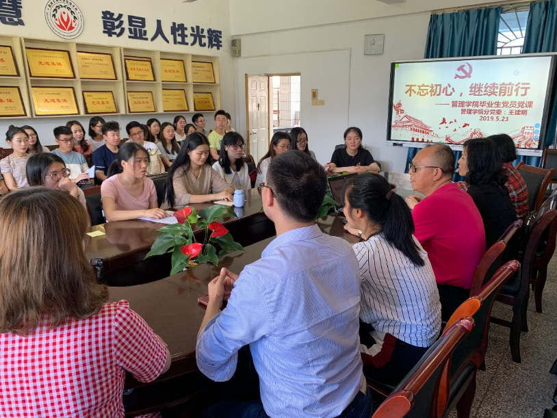2019年5月23日中午12:50,管理学院2019年毕业生党员党课在明德楼3021开讲。管理学院分党委书记、副院长王建明,分党委副书记、纪委书记王静,学生一支部书记王瑛,学生二支部书记谭予涵,学生三支部书记聂树平,研究生支部书记曾俣琳出席本次党课,管理学院毕业生党员参加此次党课学习。