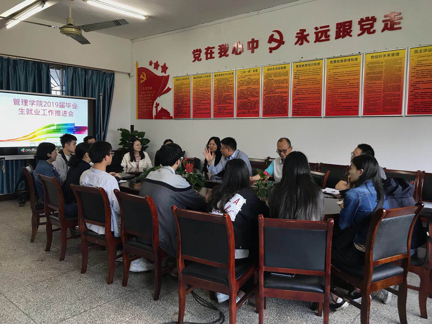 在毕业季来临之际,2019年5月29日下午3:00,管理学院在明德楼3021会议室召开了2019届毕业生就业工作推进会。管理学院分党委书记、副院长王建明,院长、分党委副书记杨柏,分党委副书记、纪委书记王静等领导出席了会议。学院就业工作负责人刘榴老师以及2019届毕业班辅导员聂树平老师、王瑛老师和各班毕业生代表参加了会议。