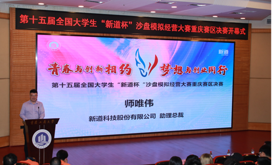 主办单位新道科技股份有限公司助理总裁师唯伟先生在讲话中向竞赛的承办单位重庆工商大学表示了感谢,回忆了参加竞赛的沙迷(对沙盘大赛粉丝的昵称)们带给自己的感动。师总回顾新道杯沙盘大赛举办十五届以来,从传统的ERP物理沙盘时期发展到今天的互联网沙盘时代,竞赛的表现形式不断追随技术创新的步伐,与时俱进,目前已成为经管类学科竞赛中规模最大、影响力最广的赛事之一。