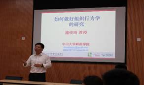 论坛开始前,学院副院长黄钟仪教授对施俊琦教授做了热情的介绍,并特别感谢他于百忙中抱着病躯仍挤出时间来我院做讲座的关爱情和尽责心。施俊琦教授是国家自然科学基金委杰出青年基金获得者,珠江学者特聘教授,教育部长江学者青年学者,中山大学岭南(大学)学院管理学教授,博士生导师,是组织行为学研究领域的顶尖学者,已在世界顶级管理学刊物上发表论文数十篇。