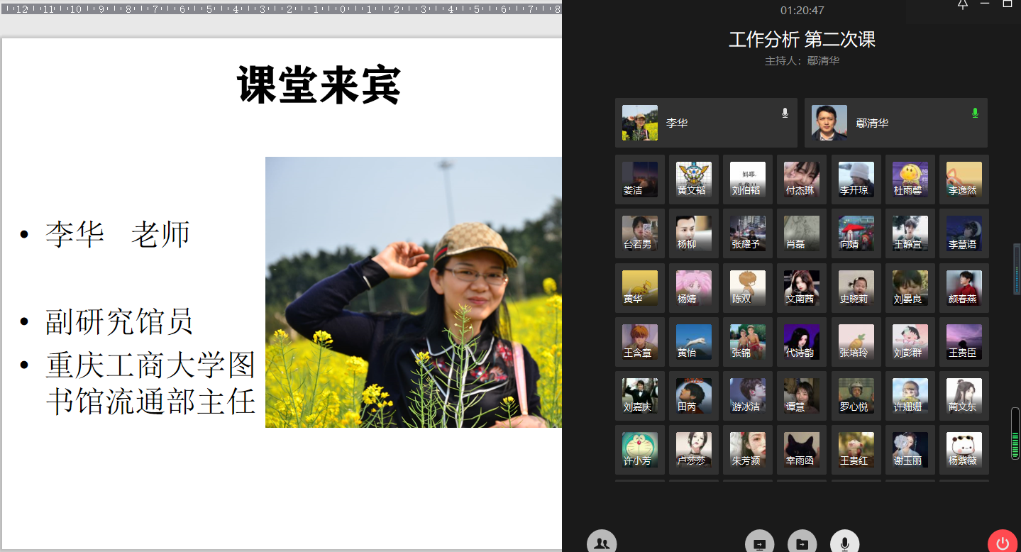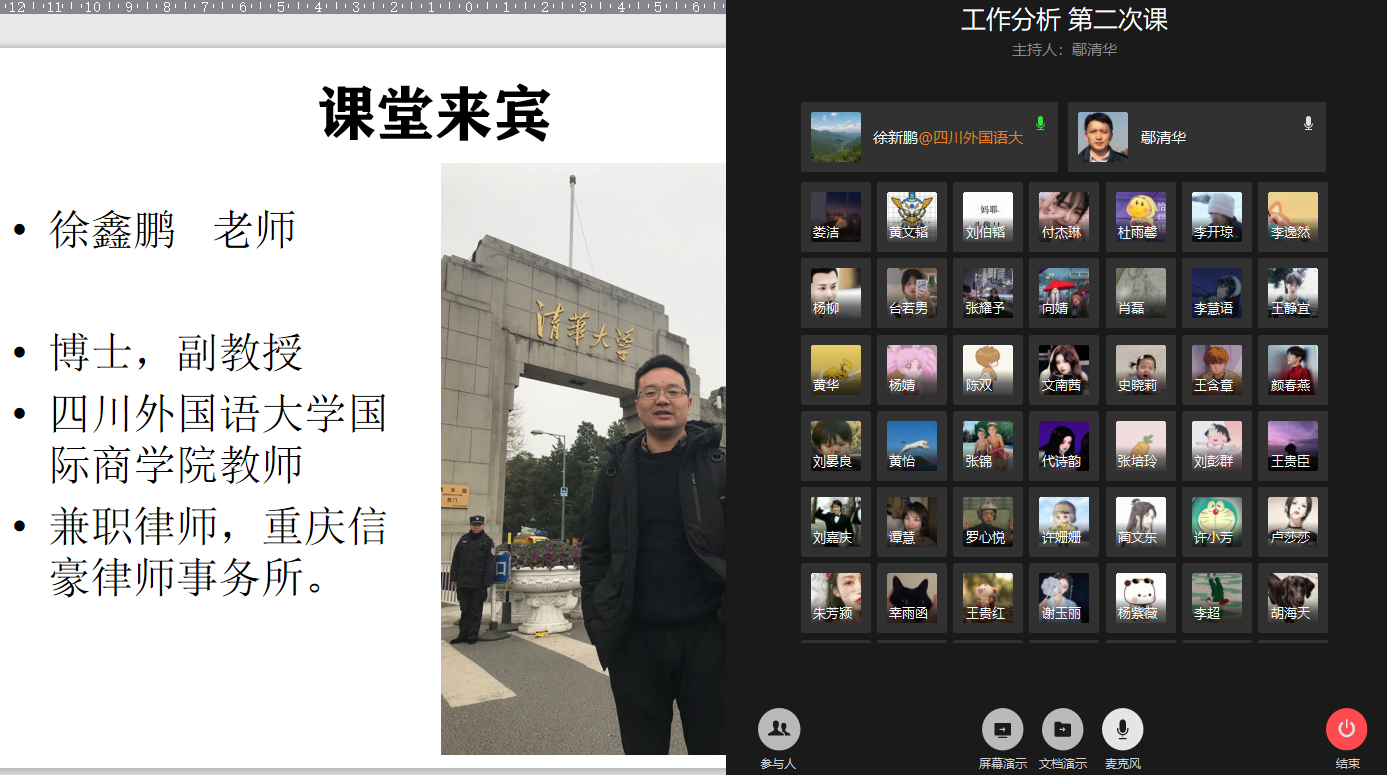 在第一周网络教学中,我系教师积极探索引入企业人士进入网络课堂与师生互动交流,先后邀请了金科地产、海尔物流的企业高管探讨相关主题,取得良好的课堂反馈。受到学校学院的肯定,为进一步纵深推进在线教学工作,人力资源管理系主任郑月龙博士与人力资源管理专业冉景亮博士、鄢清华老师等进行了积极探讨,并于2020年3月9日(周一),以《工作分析》课程先行试水,授课教师鄢清华老师进一步探索将这种模式扩展为一种全景式网络课堂。所谓工商管理学科课程全景课堂,以往的教学模式是将具体的案例的视频、场景、角色等的呈现方式的全景化,使学生感受更真实全面。而网络教学模式下,由于课堂与外部资源的连接更为便利,可以实现课堂教学与外部的企业、专家、相关的工作人员直接对接,是另外一种意义上的全景式课堂。