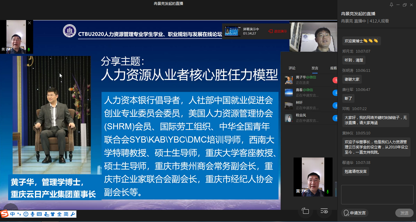 2020年3月14日上午9点,在我国新冠肺炎疫情防控趋势积极向好背景下,CTBU2020年人力资源管理专业学生学业、职业规划与发展在线论坛通过重庆工商大学“企业微信”平台直播顺利召开。出席此次在线论坛的有重庆工商大学副校长李国军教授,管理学院分党委书记王建明同志、院长杨柏教授、分党委副书记、纪委书记王静、副院长周莉教授、副院长黄钟仪教授、管理学院人力资源管理系系主任郑月龙博士。论坛邀请到重庆云日产业集团董事长黄子华博士为特邀嘉宾并作主题发言,邀请到校友嘉宾广州名度网络科技有限公司创始人、总经理张喜春先生,重庆房地产职业学院彭茜老师,重庆中雷律师事务所副主任、创始合伙人王明涛律师及重庆中科建设(集团)有限公司人力资源部曹洋铭总监等出席并发言分享。人力资源管理系全体老师、校友、同学、家长共计450余人次参与了论坛。论坛由管理学院人力资源管理系冉景亮博士主持。