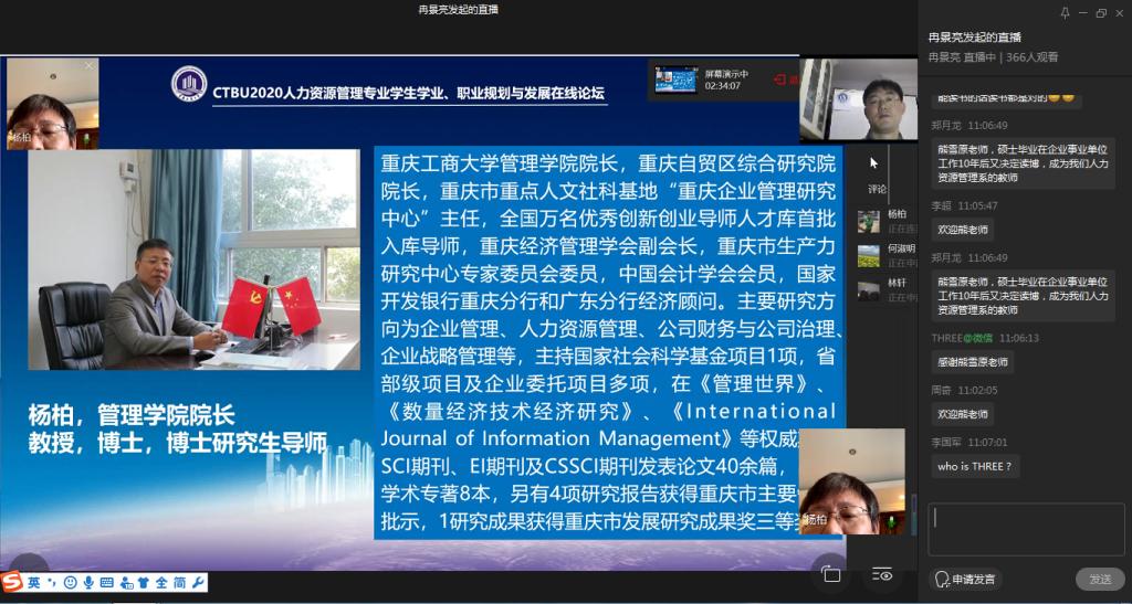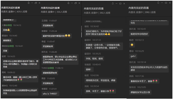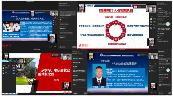 接着,论坛进入嘉宾分享环节。特邀嘉宾黄子华博士为大家讲解了人力资源从业者核心胜任力模型,并提出优秀的HR从业者的素质包括快速学习能力,跨文化沟通能力以及能快速融入当地的社会网络的能力,简短的分享,直指关键,使同学们和在线参会人员获益颇多;校友嘉宾张春喜总经理从业务方面告诉大家要“深入业务发展,成就多彩人生”,指出人力资源管理要深入业务、助力业务发展,同时结合自己的经历分享感悟,启迪学弟学妹们如何少走弯路、成就属于自己的精彩人生;校友嘉宾彭茜老师结合自身经历,分享了自己的学习、考研到就业的成长之路,勉励人资学子勤学奋进,不断拼搏,为论坛筹备组针对当下学生们关心的考研问题,特意邀请彭茜校友分享经验;校友嘉宾王明涛律师从律师的专业角度为大家阐述了HR从业者的法律素养,并通过实际案例阐述HR从业者法律素养的重要性,具备基本的法律素养,助力HR从业者职业生涯稳健向前发展;校友嘉宾曹洋铭总监与大家分享了如何营造个人及组织环境、助推HR生态发展,曹总监结合自身职业发展经历,从企业视角下的优秀人才、优秀人力资源从业者特质、如何构建个人成长池及如何构建个人-家庭成长圈等方面进行了精彩分享。嘉宾的分享,不同的视角,同一个目的,即使HR专业的同学们如何找准自己的路、成就属于自己的职业精彩,嘉宾分享过程中通过对话框同学们积极与嘉宾、老师们互动,表达自己的深刻感悟,在互动问答环节里,人力资源管理系熊雪原博士等为同学们解答了考研相关问题,师生互动意犹未尽,人力资源管理系老师讨论决定,择日召开在线答疑语音会,专为同学们答疑解惑。