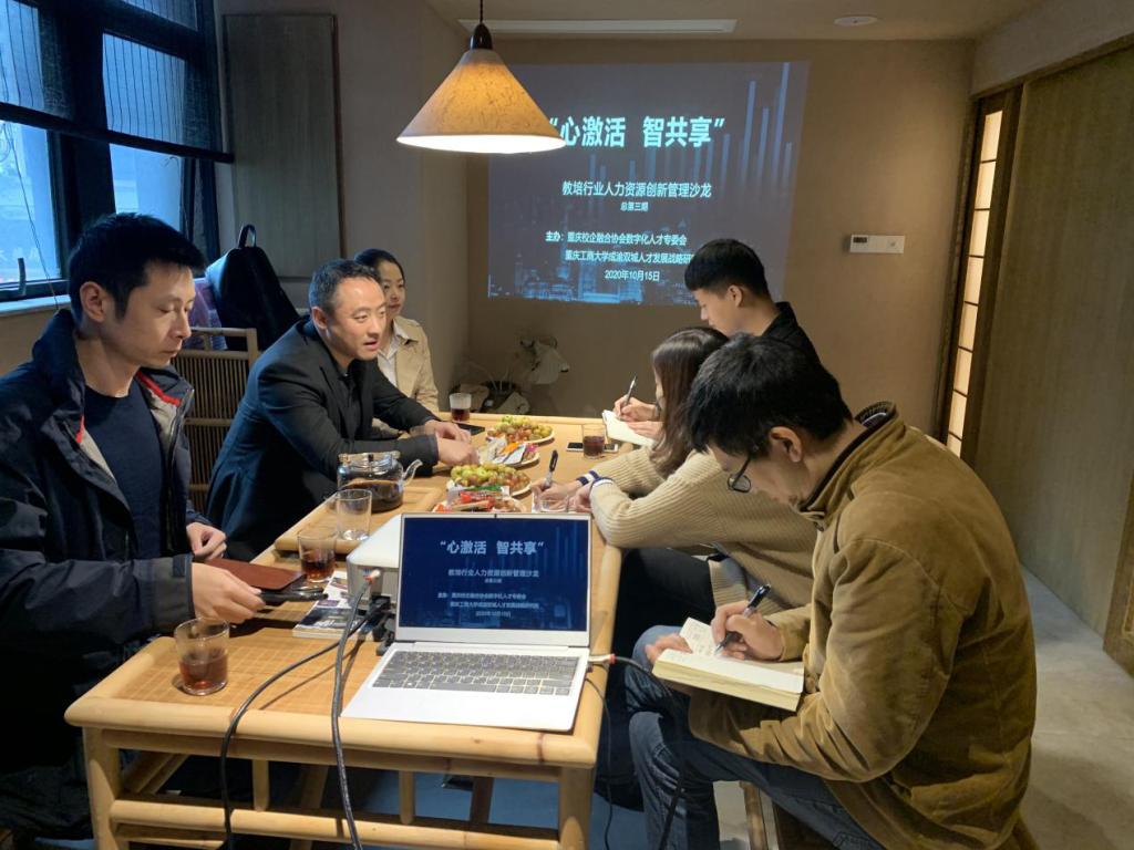 10月15日,由重庆校企融合协会数字化人才专委会主办,我院成渝双城人才发展战略研究院(以下简称“人才战略研究院”)承办的“心激活 智共享”教培行业人力资源创新管理沙龙在九龙坡区华宇时代星空广场举行。重庆英豪教育信息咨询有限公司人事经理张静、综合部办公室主任贾万清先生、重庆欧文教育科技集团有限公司人事经理夏瑄屿、重庆南岸蒙田教育培训学校高管王宪、重庆专注教育咨询有限责任公司人事专员谭川、重庆校企融合协会数字化人才专委会负责人黄晶,以及我院人才战略研究院熊雪原博士参加了沙龙。沙龙由重庆校企融合协会数字化人才专委会主任黄晶先生主持。