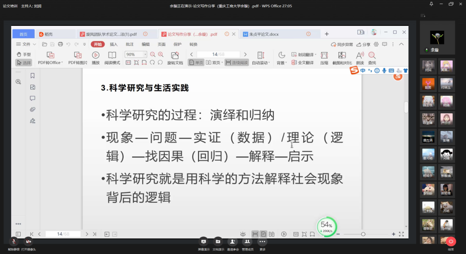 会议伊始,余璇教授先分享了一篇优秀论文案例,并带领大家分析论文题目。随后,教授提出,开始写论文前需要先思考“三找逻辑”。第一个逻辑即“找问题”,写好一篇论文的前提是找到一个好的研究问题,搞清楚论文写什么;第二个逻辑即“找答案”,完成一篇论文的基础是论证思路要清晰,想清楚论文怎么写;第三个逻辑即“找应用”,写论文的最终目的是为了解决实践中的痛点,搞明白论文写给谁。