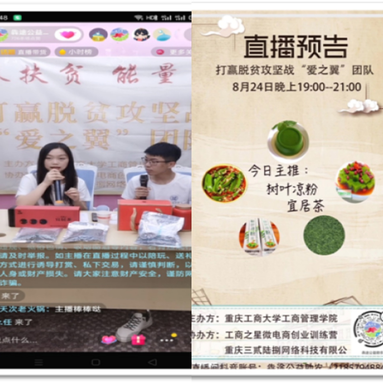 “打赢脱贫攻坚战”爱之翼团队针对国家今年确定的重庆14个贫困县开展调研实践活动。邀请专业MCN公司和工商之星微电商创业训练营、营销策划系专业老师莫小平、樊华、白仁春共同为学生进行新媒体营销培训,并指导学生开通公益助农抖音号,学生通过拍视频、直播等方式,运用市场营销知识,助力农产品线上销售,投身打赢脱贫攻坚战。