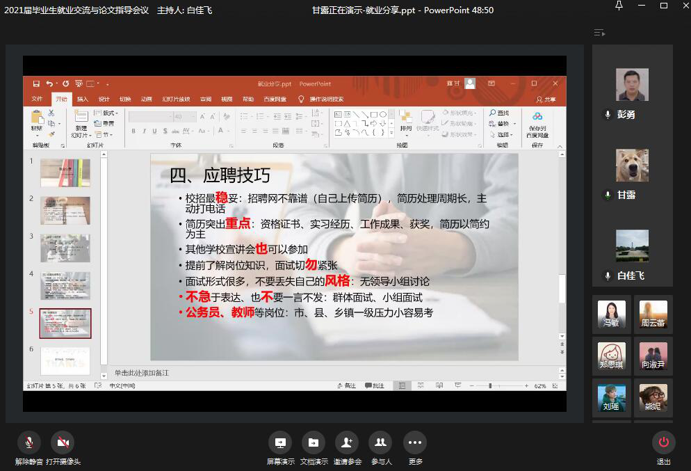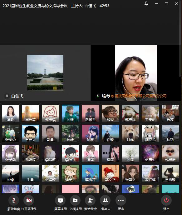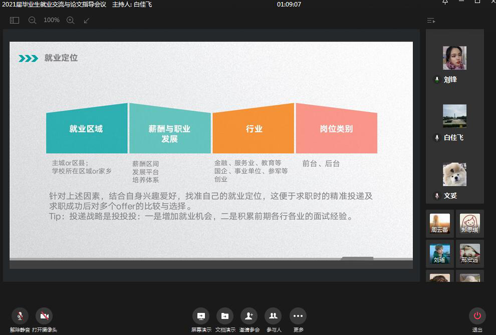 此次线上会议通过学院老师和优秀校友,和同学们分享了宝贵的求职应聘的经验,帮助学生们厘清就业思路,拓宽了学生们的就业渠道,鼓励同学们勇于投身到社会工作中去。