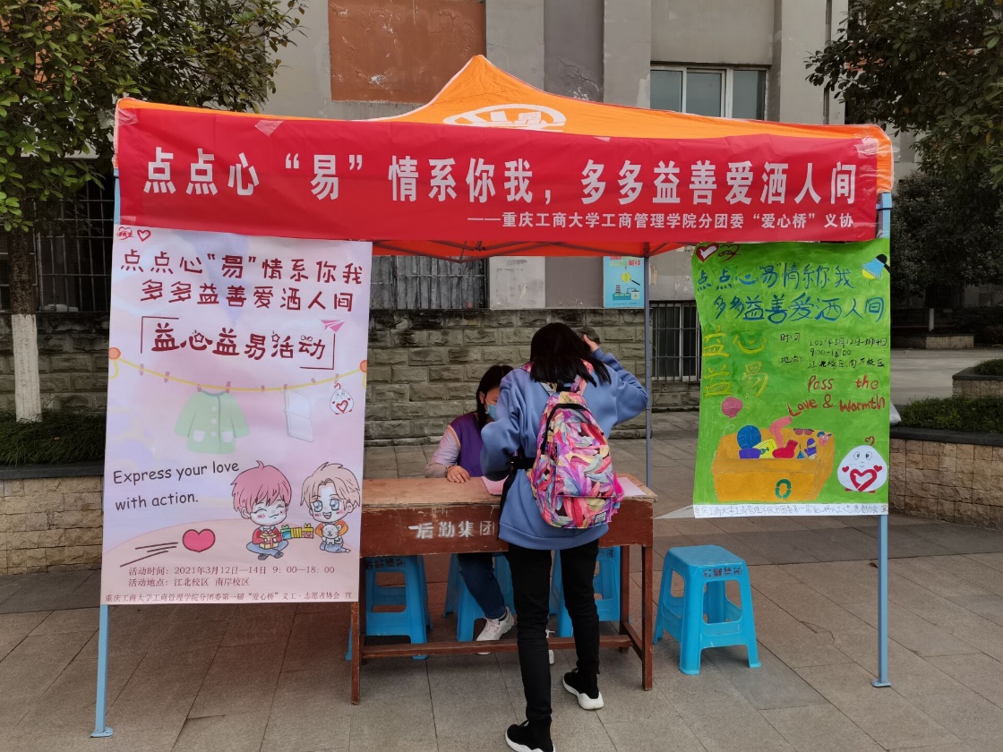 爱是连接人与人之间的组节、心与心之间的纽带。“赠人玫瑰,手留余香。”为了将闲置物品最大化利用,践行“奉献、友爱、互助、进步”的志愿服务精神,2021年3月12日-3月14日,122cc太阳集成游戏分团委“爱心桥”义工•志愿者协会分别在重庆工商大学江北校区和南岸校区设点,举办了以“点点心‘易’情系你我,多多益善爱洒人间”为主题的益心益易活动,旨在用小小的物资传递出大大的能量。