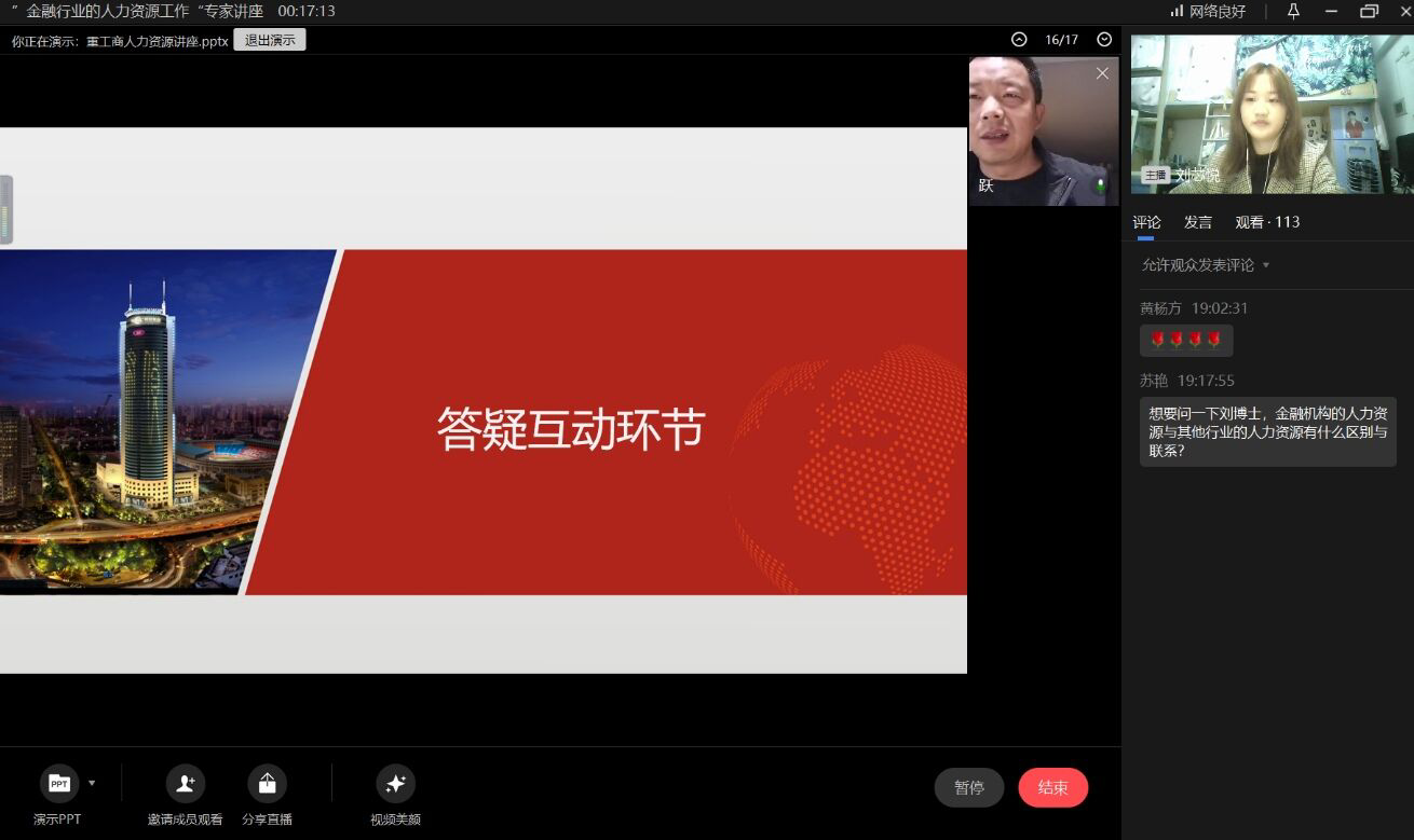 2021年3月20日19:00,由122cc太阳集成游戏人力资源管理系HR春蕾协会组织的“如何做好金融行业的人力资源工作”专家讲座在企业微信平台成功举办。主讲嘉宾为长期供职于金融机构,具有丰富行业经验的刘发跃博士,重庆工商大学人力资源管理专业全体学子参与了讲座。刘发跃博士讲座的主要内容为金融机构的人力资源岗位介绍以及如何胜任金融机构的人力资源岗位,目的在促进学生提升行业认知,培养良好择业观、就业观。