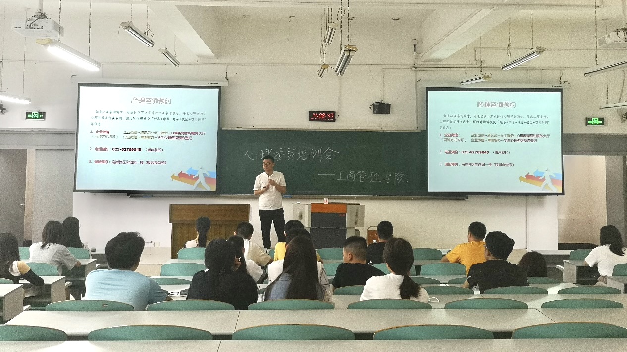 此次培训由学院工作站指导老师、校心理中心兼职心理咨询师周明老师主讲,他结合工作实际,就“心理委员的工作职责”、“心理危机的识别”、“朋辈心理帮扶技巧”等几个方面的内容进行了深入的讲解。