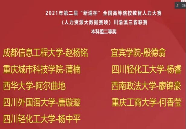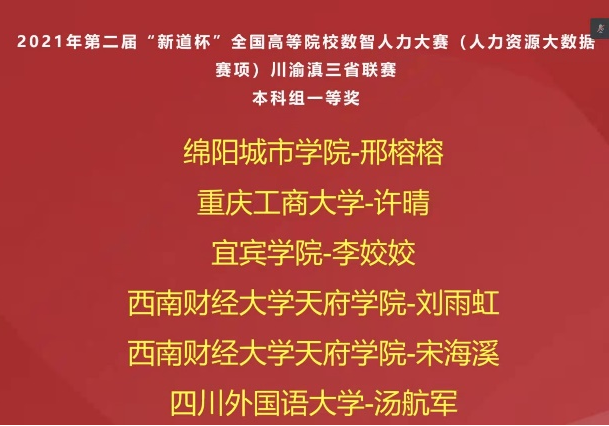 2021年10月16日,第二届“新道杯”全国高等院校数智人力大赛(人力资源大数据赛项)川渝滇三省联赛落下帷幕。经过紧张激烈的专家评审和线上答辩,人力资源管理系学子获得了本科组一等奖一项,二等奖一项的喜人成绩。 本次联赛人力资源系共选送两支队伍,其中“取经团队”的陈滢、钱芳瑜、李星星、许晴四位同学获得本科组一等奖;“上学威龙队”的徐墁、何香莹、马思佳、赖兴佳四位同学获得本科组二等奖;指导老师熊雪原获得“优秀指导老师”称号。