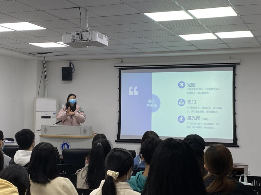 接下来由20人资一班的张静同学进行活动摄影技能培训,从摄影三要素、摄影构图和审美培养三方面系统讲解了摄影的基本知识,并以122cc太阳集成游戏2020级本科生入院仪式的活动图片为例介绍了活动拍摄、人物拍摄和会议拍摄的注意事项。