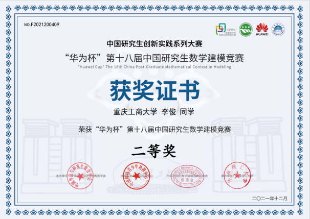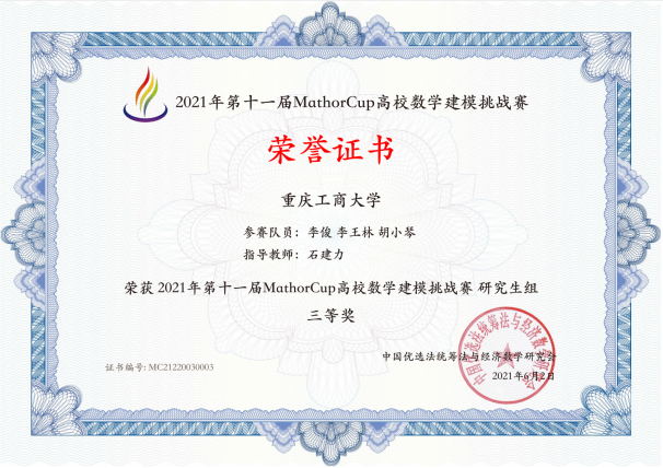 我院企业管理专业硕士研究生李俊、李王林和胡小琴在2021年数学建模竞赛中喜获佳绩,分别获得2021年第十一届MathorCup高校数学建模挑战赛研究生组全国三等奖和“华为杯”第十八届中国研究生数学建模竞赛全国二等奖。