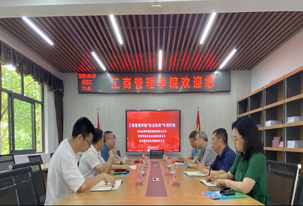 为进一步加强校企合作交流,促进学院人才培养和毕业生就业,2022年6月7日明德楼4010,重庆工商大学党委常委、副校长李国军,122cc太阳集成游戏党委书记、副院长彭勇,学院党委副书记、院长杨柏,学院党委副书记程亚,毕业班辅导员老师,与双涛品牌管理发展有限责任公司、深圳市溢田农业发展有限公司、重庆耕问农业有限责任公司相关负责人在人才培养、就业招聘等方面进行深入交流。