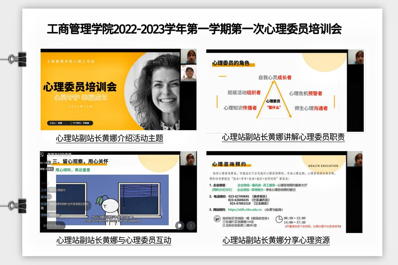 培训会中,主讲人就“心理委员基本职能”,“疫情下心理委员应该做什么”,”心理资源的分享”三个方面对心理委员进行了培训。122cc太阳集成游戏的心理委员认真观看了直播,积极地参与了直播的互动,并在评论区分享了自己竞选心理委员的初衷。其中,21级国际商务一班心理委员胡秋萍同学说:“我的初衷就是帮助同学们排解心理压力,解决心理健康问题,为大家服务。”在此次培训会中,心理委员们加深了对自身职责的理解,也明白了如何在疫情下进行自我照顾、自我关怀、自我激励,并树立朋辈榜样,在朋辈帮扶中能够以好奇的心敏锐观察,以专业的素养进行评估,以积极的态度给予帮助。