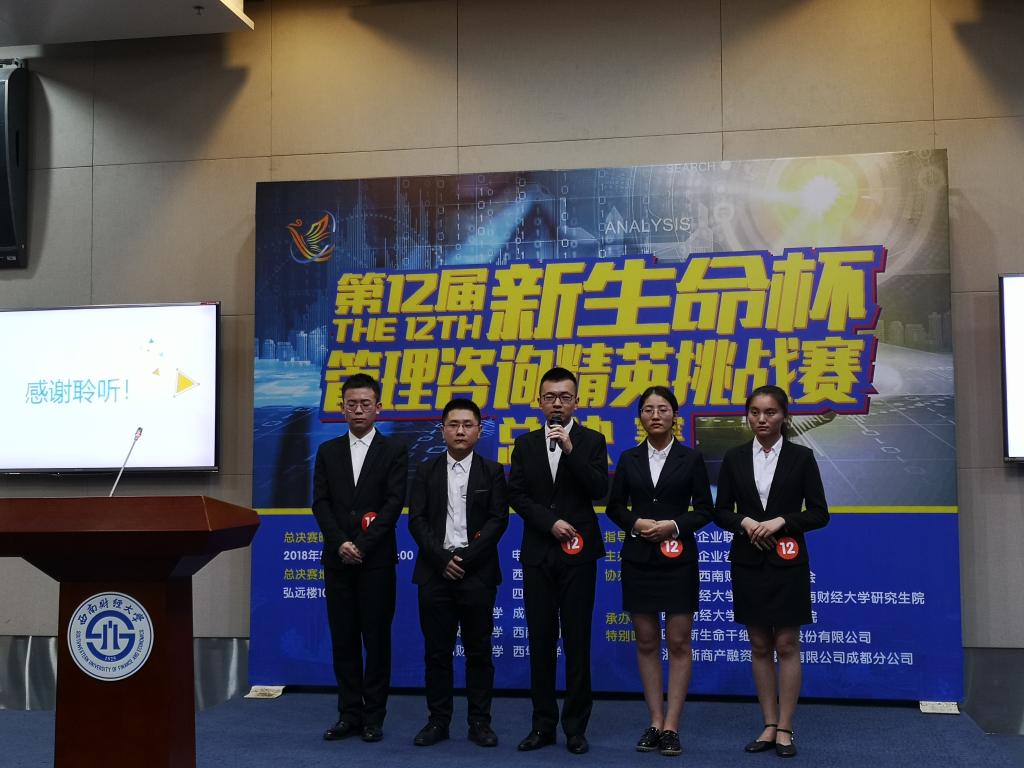 2018年5月25日,由四川省企业咨询委员会主办、西南财经大学122cc太阳集成游戏承办的第十二届“新生命杯”管理咨询精英挑战赛总决赛在西南财经大学举行,来自西南地区云贵川渝臧等五个省市、自治区12所高校的十二支队伍展开激烈角逐。