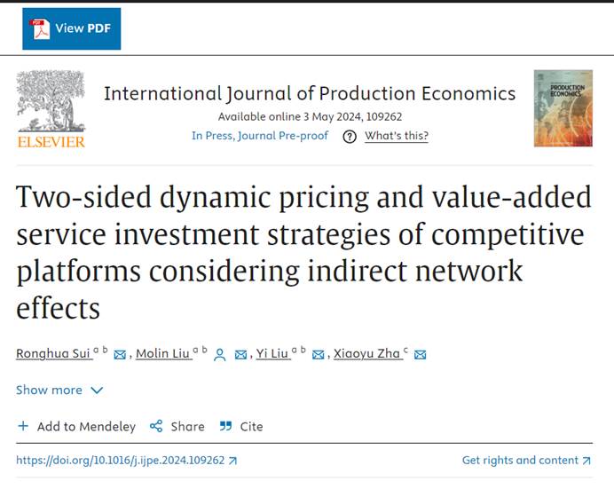 Sui R, Liu M, Liu Y, et al. Two-sided dynamic pricing and value-added service investment strategies of competitive platforms considering indirect network effects[J]. International Journal of Production Economics, 2024: 109262.