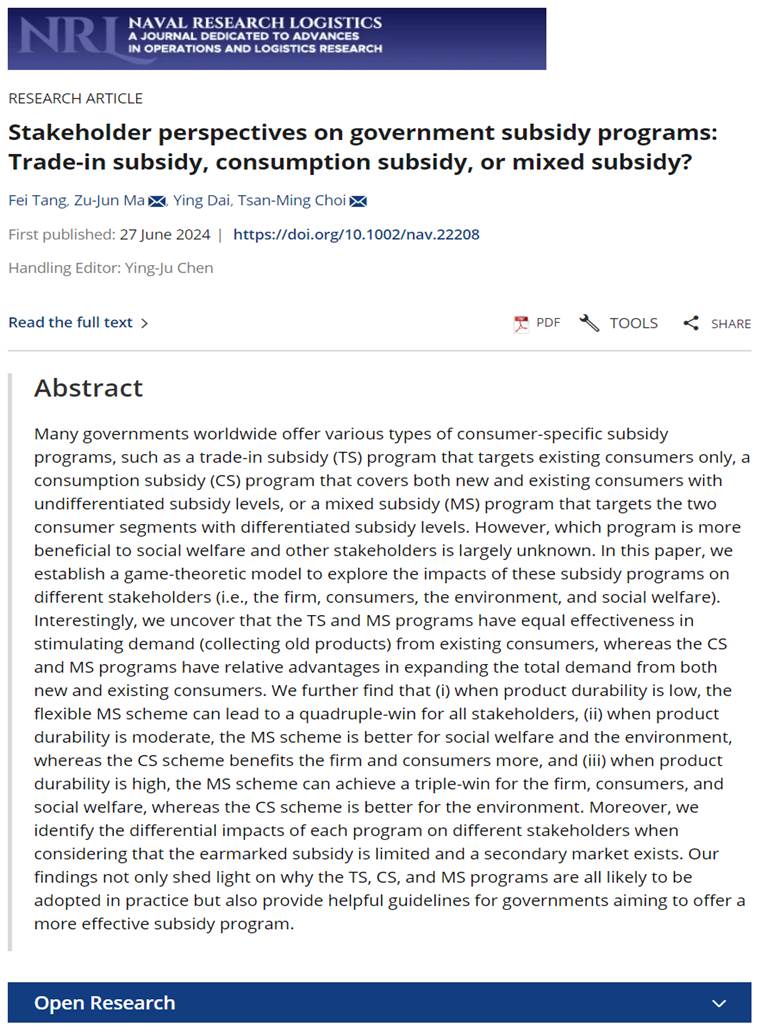 Tang F, Ma Z J, Dai Y, et al. Stakeholder perspectives on government subsidy programs: Trade‐in subsidy, consumption subsidy, or mixed subsidy?[J]. Naval Research Logistics (NRL), Online.(ABS 3星期刊)