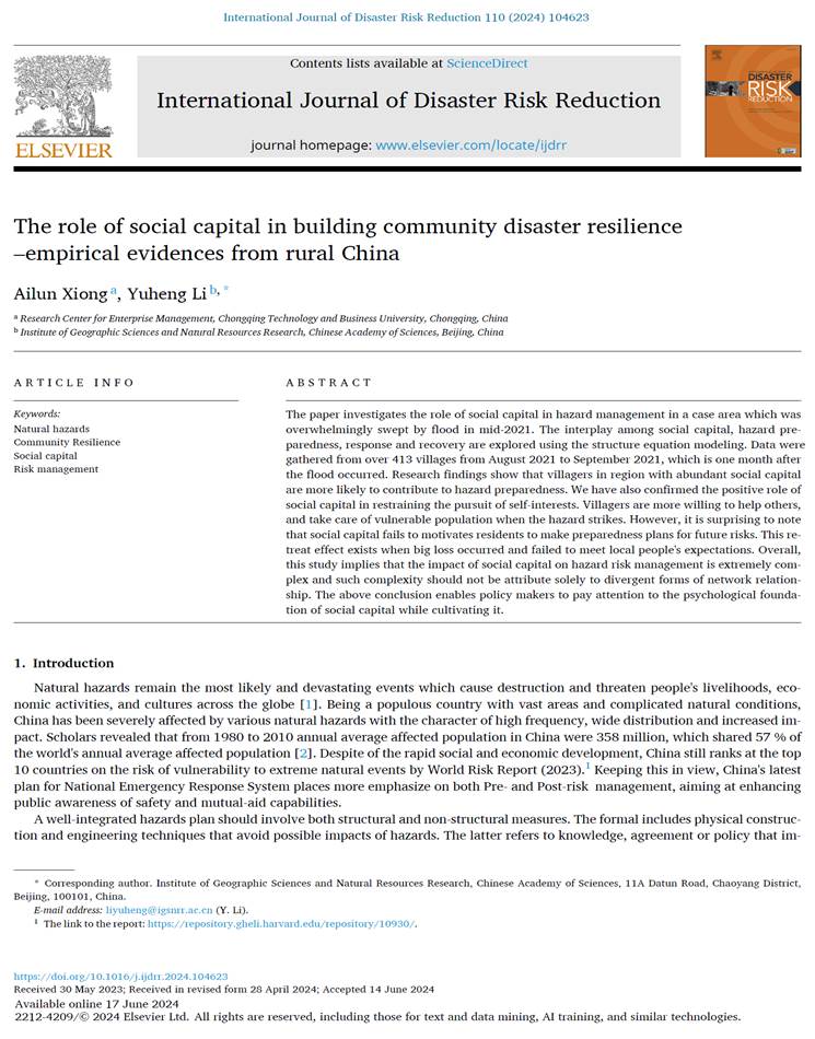 Ailun Xiong, Yuheng Li. The role of social capital in building community disaster resilience –empirical evidences from rural China [J]. International Journal of Disaster Risk Reduction, 2024, 110:104623. (中科院SCI一区Top期刊)