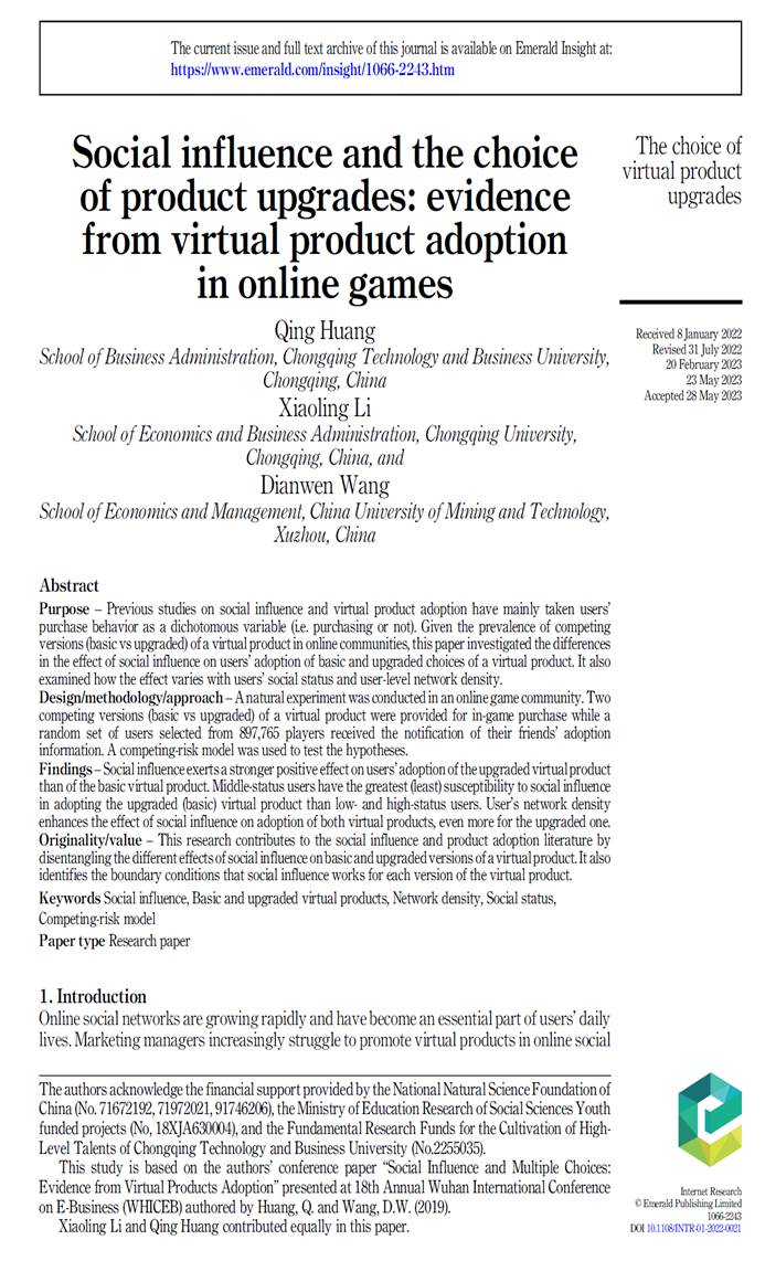 Huang Q, Li X, Wang D. Social influence and the choice of product upgrades: evidence from virtual product adoption in online games[J]. Internet Research, 2024.(ABS-3星期刊)