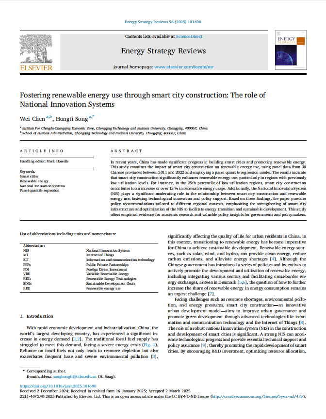 Chen W, Song H T*(通讯作者). Fostering Renewable Energy Use through Smart City Construction: The Role of National Innovation Systems[J]. Energy Strategy Reviews, 2025, 58: 101690. (SCI JCR一区、中科院SCI二区期刊)