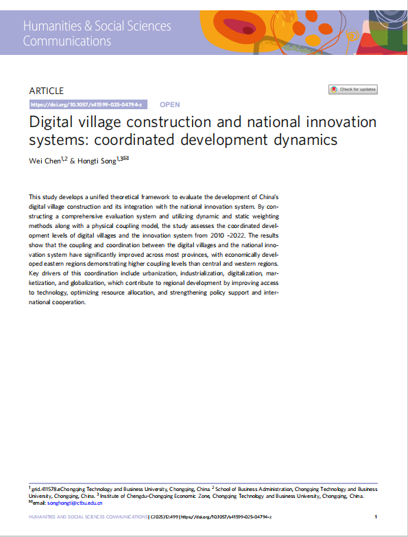 Chen W, Song H T*(通讯作者). Digital village construction and national innovation systems: coordinated development dynamics[J]. Humanities & Social Sciences Communications 12, 49 (2025). https://doi.org/10.1057/s41599-025-04794-z