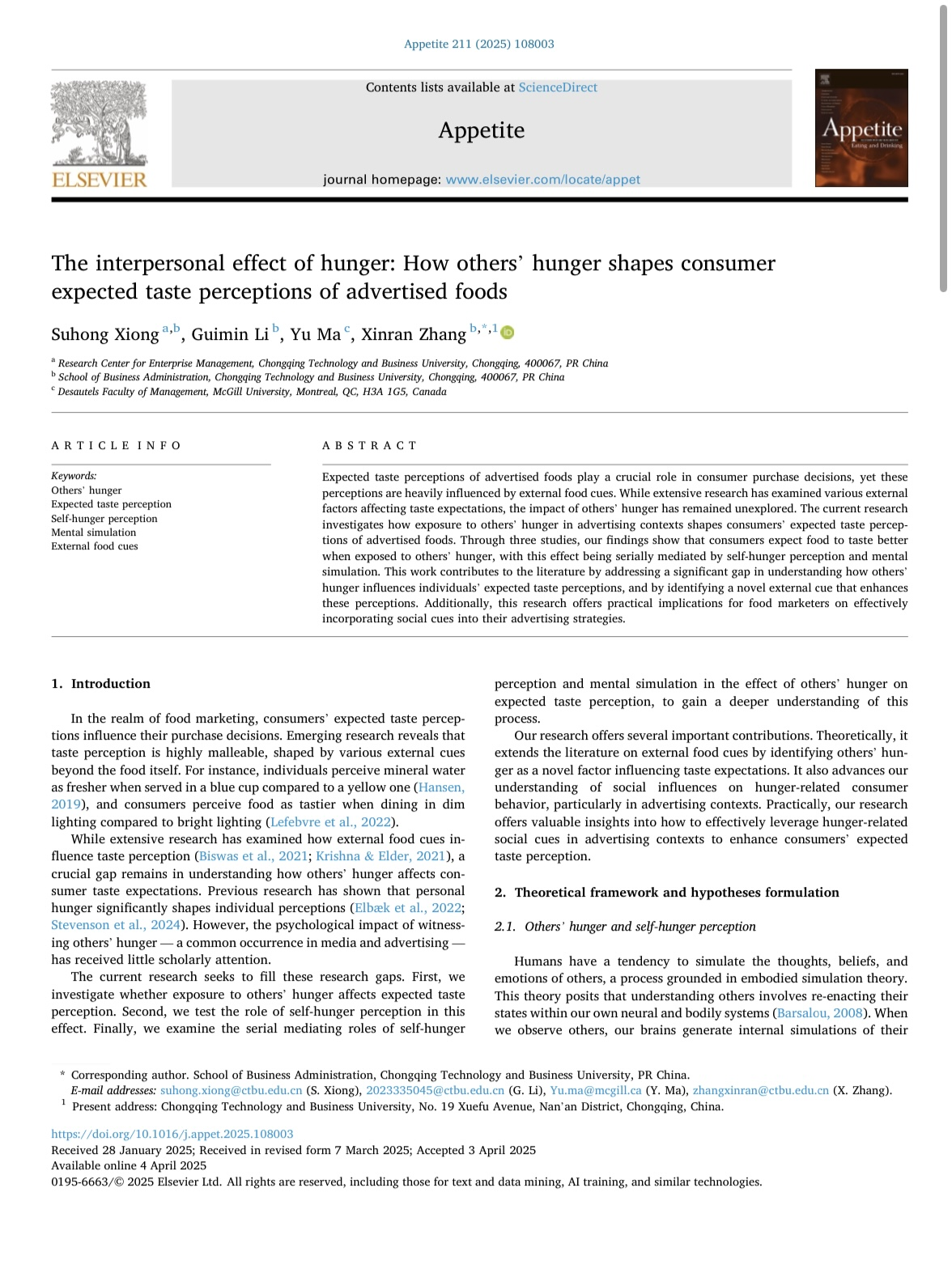 Xiong S, Li G, Ma Y, Zhang X*(通讯作者). The interpersonal effect of hunger: How others’ hunger shapes consumer expected taste perceptions of advertised foods[J]. Appetite, 2025: 108003.