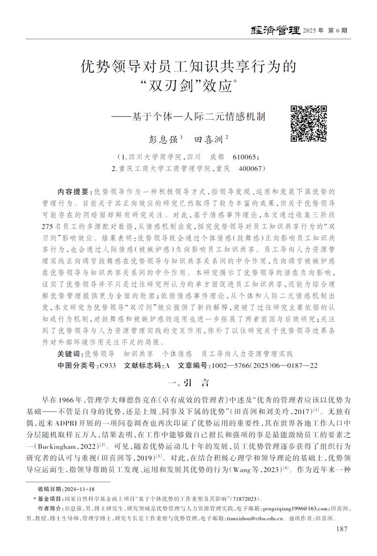 彭息强,田喜洲.优势领导对员工知识共享行为的“双刃剑”效应——基于个体—人际二元情感机制[J].经济管理, 2025, 47(06):187-208.