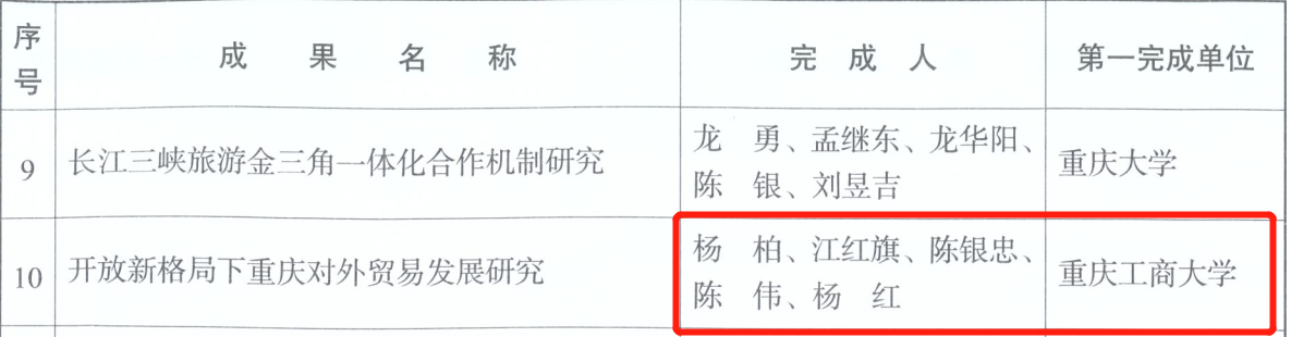 2020年12月,我院院长杨柏教授团队撰写的研究报告《开放新格局下重庆对外贸易发展研究》获第七届重庆市发展研究奖三等奖。