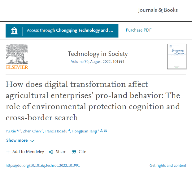 Xie Yu, Chen Zhen, Boadu Francis, Hongjuan Tang. How does digital transformation affect agricultural enterprises’ pro-land behavior: The role of environmental protection cognition and cross-border search[J]. Technology in Society, 2022 (70): 101991.