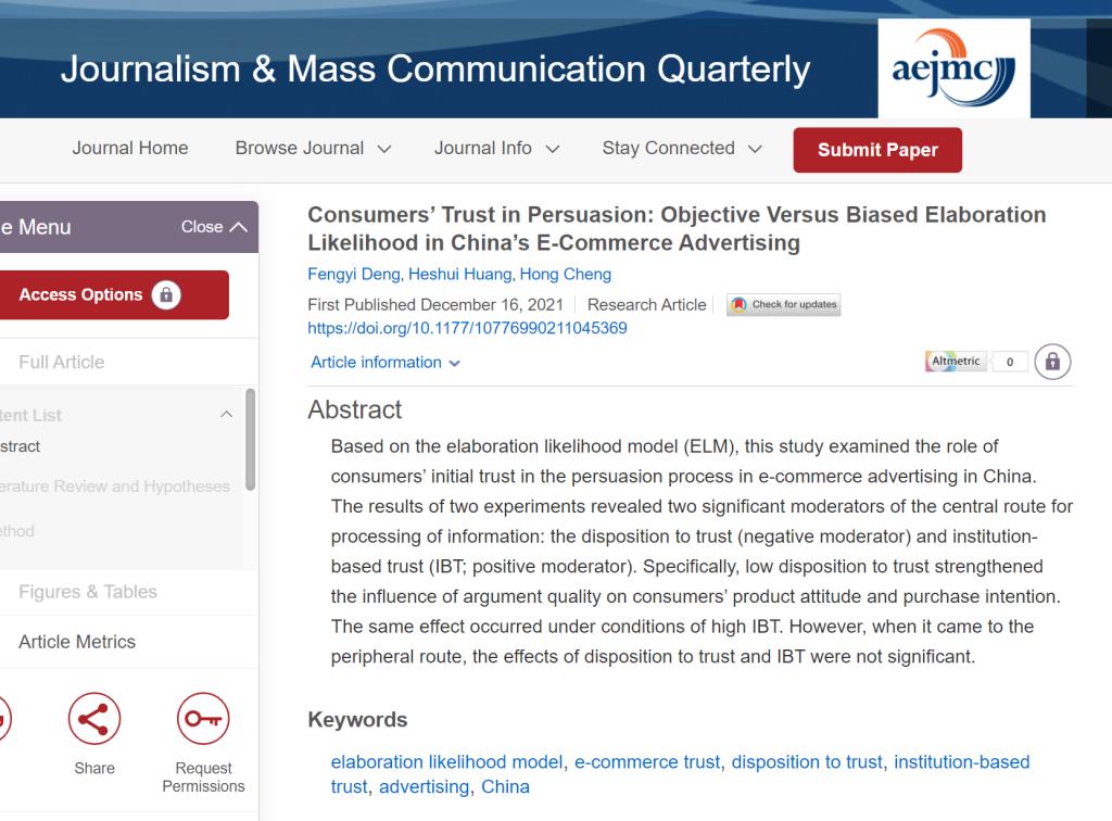 近日,122cc太阳集成游戏邓凤仪博士以第一作者在国际SSCI期刊Journalism & Mass Communication Quarterly(JCR一区,中科院三区)发表题为“Consumers’ Trust in Persuasion: Objective Versus Biased Elaboration Likelihood in China’s E-Commerce Advertising”的研究论文,重庆工商大学为该研究的第一单位。