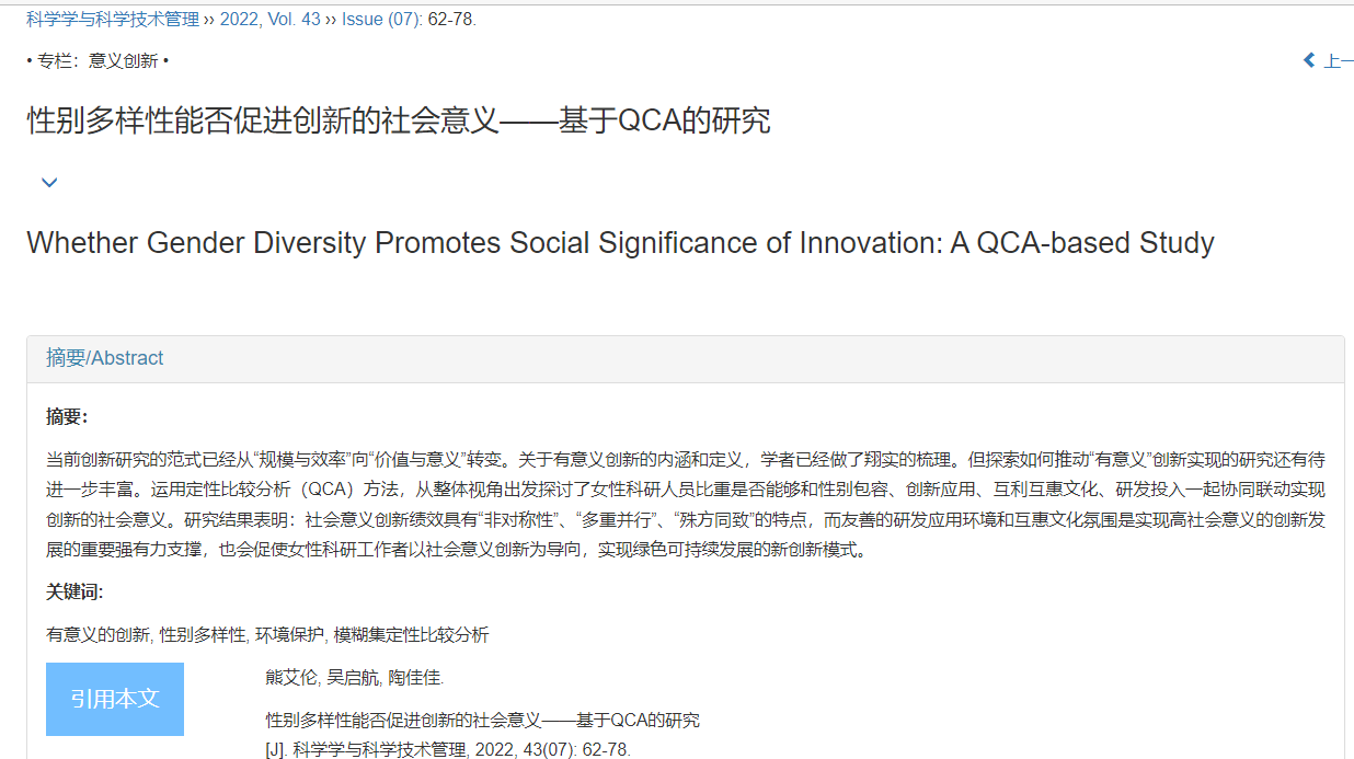 近日,我院熊艾伦副教授及其团队所撰写的论文—— 《性别多样性能否促进创新的社会意义——基于QCA的研究》被《科学学与科学技术管理》录用并于2022年第7期发表。《科学学与科学技术管理》是我国创刊最早的关于科学技术管理理论与实践研究方面的综合类科技期刊,由天津市科学技术发展战略研究院主办,被国家自然科学基金委管理科学部评定为重要期刊(B类)。