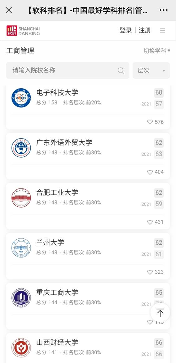 软科在2022年9月正式发布了“2022年软科中国最好学科排名”。重庆工商大学工商管理学科再创佳绩,2022年软科排名全国第65名,并继续保持上升势头。软科中国最好学科排名自2017年开始对外公开排名,排名的指标体系由软科自主研发的“学科发展水平动态监控系统”内嵌的30多项指标所组成,涉及高端人才、科研项目、成果获奖、学术论文、人才培养等方面。我校工商管理学科排名始终保持在前30%。
