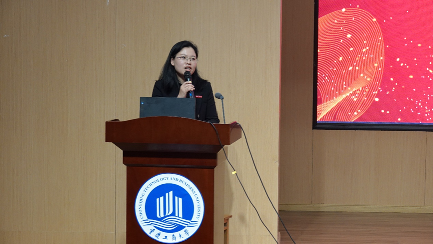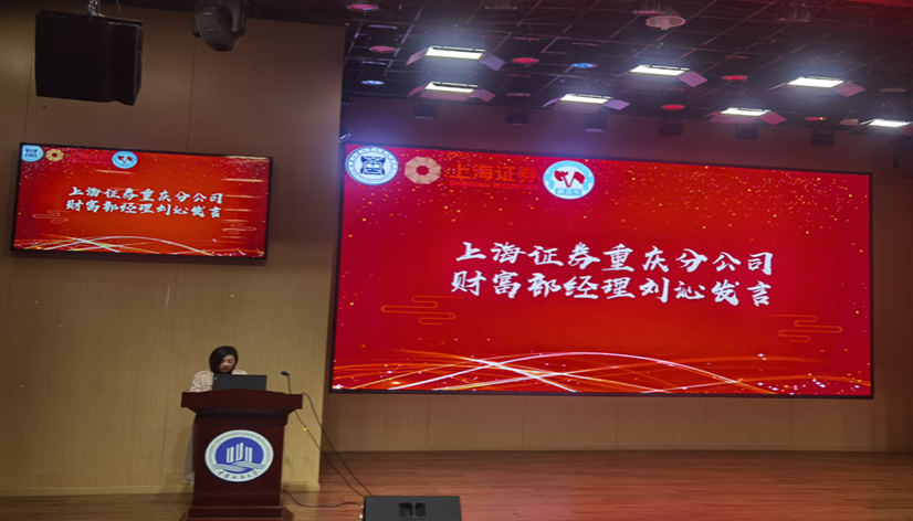 随后,上海证券重庆分公司财富部的负责人刘沁经理上台致辞。她首先对大赛的精心组织和同学们所展现的卓越才能表示了由衷的赞赏,接着对重庆工商大学参赛同学们的表现进行了深入细致的点评。