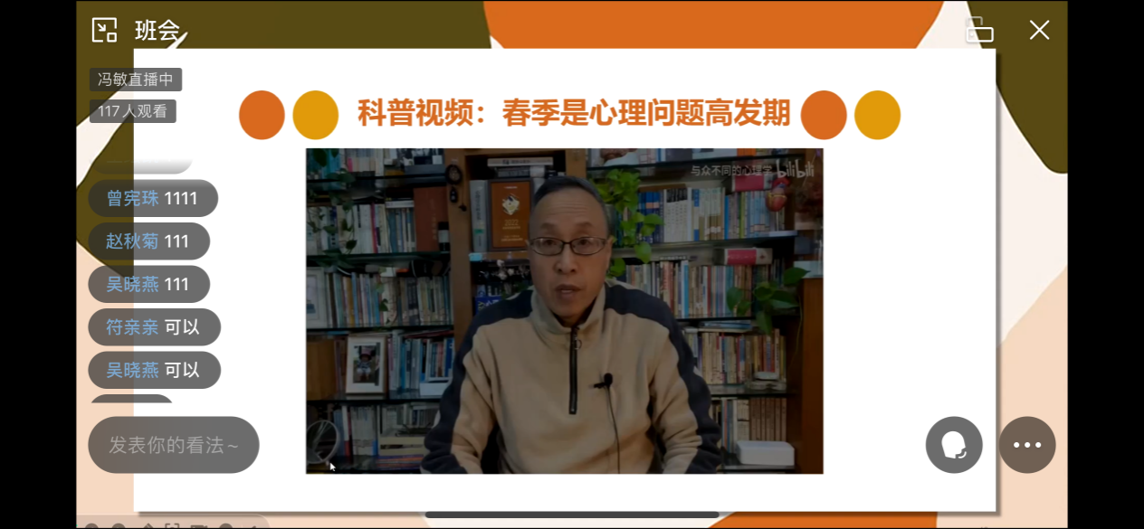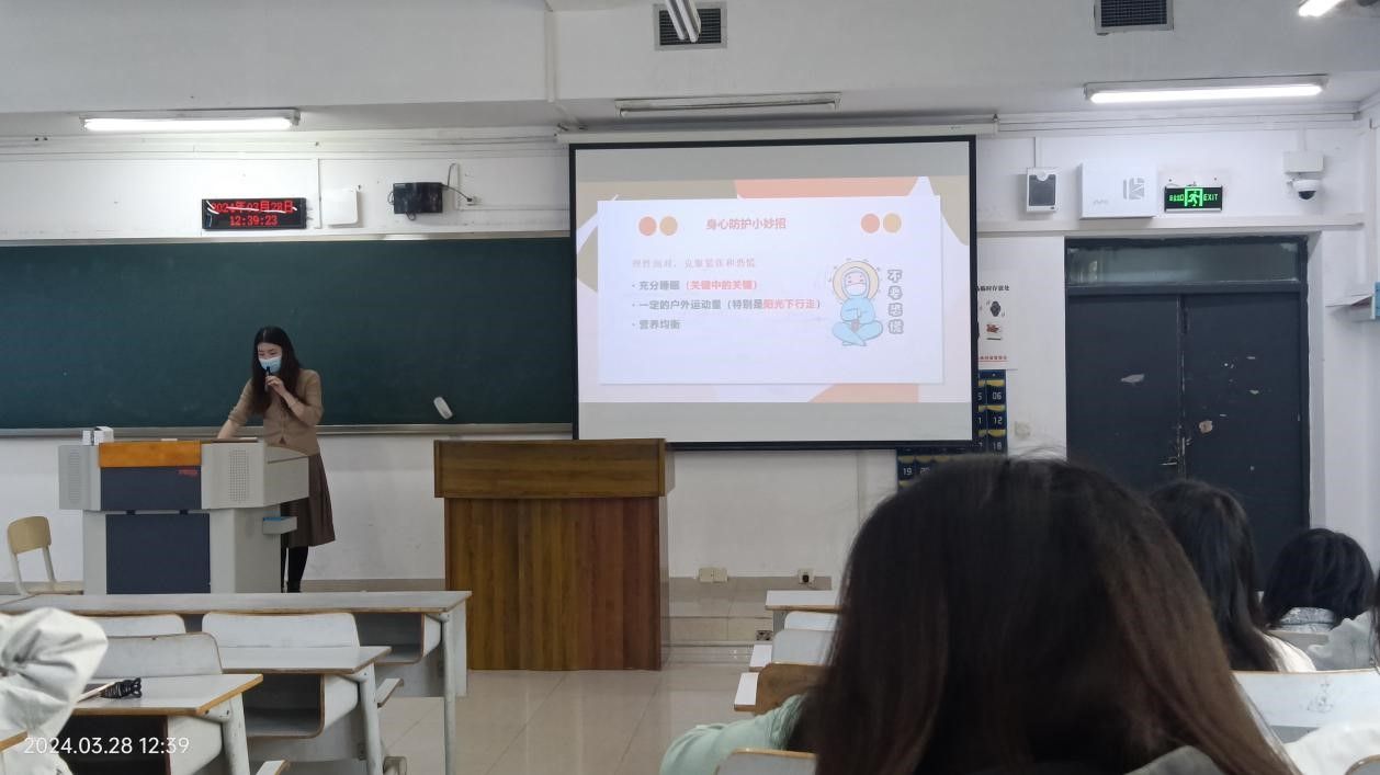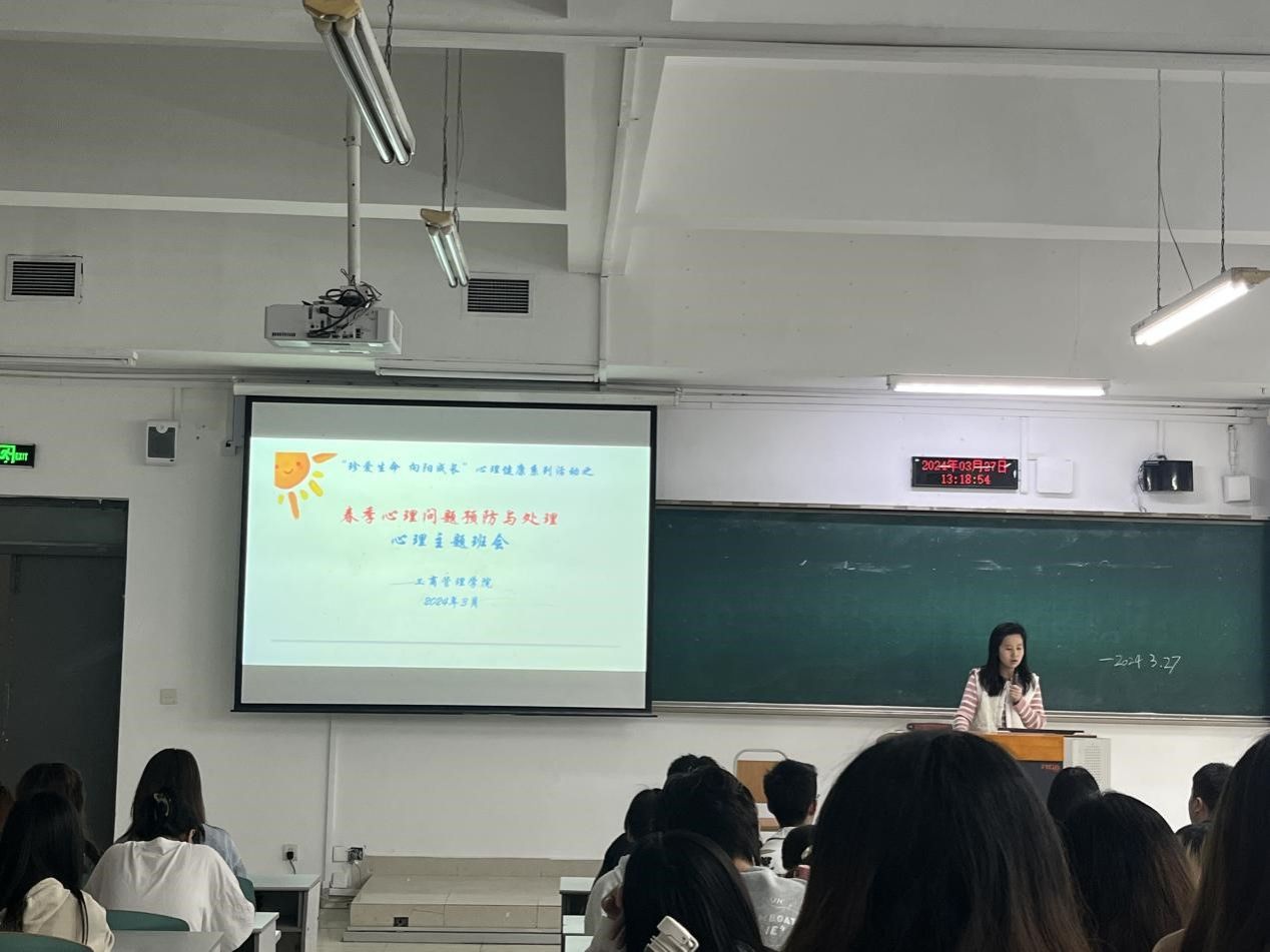 本次心理主题班会围绕“春季心理问题预防与处理”主题,采用专家讲述、视频科普等多样形式开展,通过“春季是心理问题高发期”、“正确认识抑郁症”以及“利用校内外心理资源”等环节,加深学生对春季心理问题特别是“抑郁症”的了解,进一步强化学生“积极求助意识”,引导学生合理利用校内外心理资源,做好春季心理问题的预防与处理。