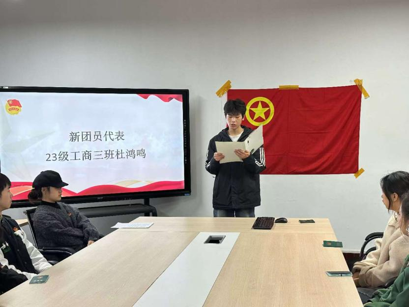 仪式在雄壮的国歌声中拉开序幕,全体师生起立,奏唱国歌。首先,主持人宣读新团员名单,由谭予涵老师为新团员代表颁发团员证及团徽。紧接着,全体新团员在领誓人的带领下,举起右拳,面向团旗庄严宣誓,铿锵有力的誓言表达了他们为共产主义事业而奋斗的决心。宣誓完毕后,谭予涵老师宣读《团章》中有关团员的义务和权利的条款,并提出了对新团员的希望和要求,强调了新团员们应该积极参与各项比赛和活动,以提升自身素养,积极进取,坚定向团组织靠拢。随后,新团员代表23级工商三班杜鸿鸣上台发言,表示将牢记团员使命,并携手新团员们共同为学校的发展贡献青春力量。23级人资一班邓棋心作为老团员代表发言,对新团员的加入表示热烈欢迎,并希望他们珍惜这份荣誉,不忘初心,砥砺前行。
