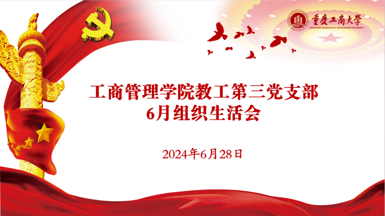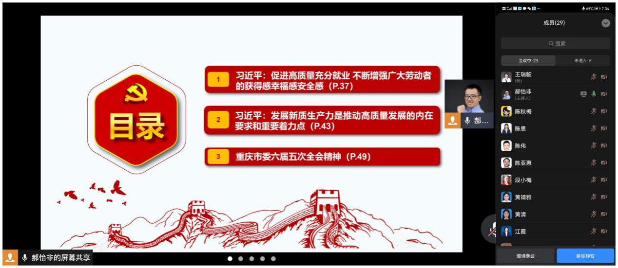628日晚,工商管理学院教工三支部于在线上召开六月组织生活会,深入学习了习近平总书记重要讲话促进高质量充分就业 不断增强广大劳动者的获得感幸福感安全感《发展新质生产力是推动高质量发展的内在要求和重要着力点》和重庆市委六届五次全会精神。旨在提升支部成员的思想理论水平和业务工作能力,更好地服务于学校高质量发展大局。本次组织生活会由支部书记郝怡非主持和领学。
