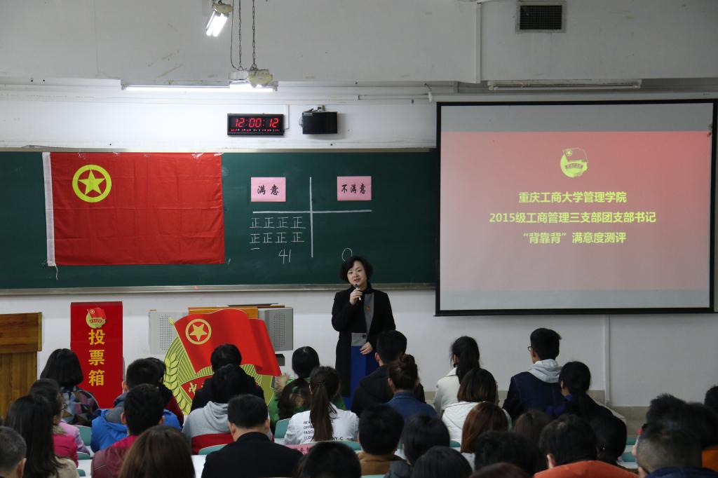 为进一步加强团支部书记队伍建设,掌握团员思想动态,深化“团支部书记工作满不满意团员说了算”的评价机制,3月16日上午11:00,对重庆工商大学管理学院2015级工商管理三支部团支书邱珂同学“背靠背”满意度的现场集中测评在我校南岸校区博智楼07122准时举行。共青团重庆市委副书记、党组织成员黄永宜,共青团重庆市委组织部部长杨春渝,共青团重庆市委高校工作部部长张斐,重庆市各大高校校团委负责人,重庆工商大学校团委、各学院分团委代表及团支书代表到场观摩此次测评。团市委也会将本次测评的全过程拍摄制作成专题纪录片分发到各大高校团支部进行学习。
