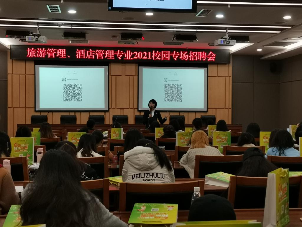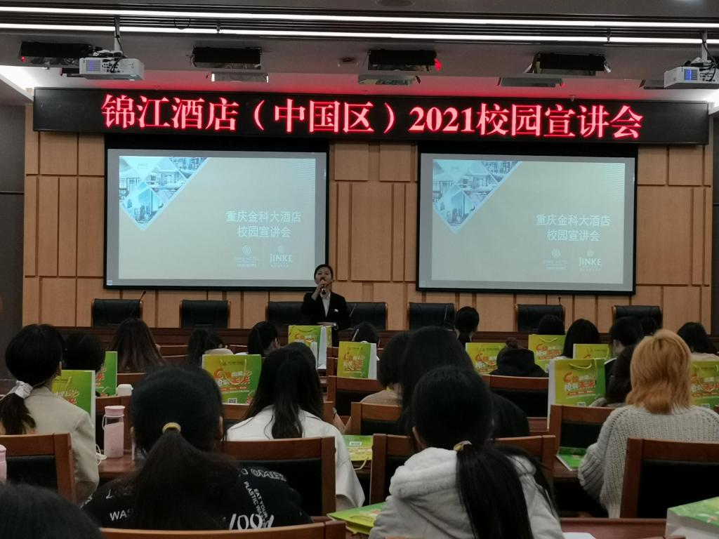 3月25日,深圳锦江酒店管理有限公司、重庆金科大酒店、成都首座万丽酒店、成都首座万豪酒店、重庆丽晶酒店受邀来到我校新图书馆一会议室开展专场宣讲会。122cc太阳集成游戏旅游管理系主任白佳飞老师和一百三十名同学参加宣讲会。