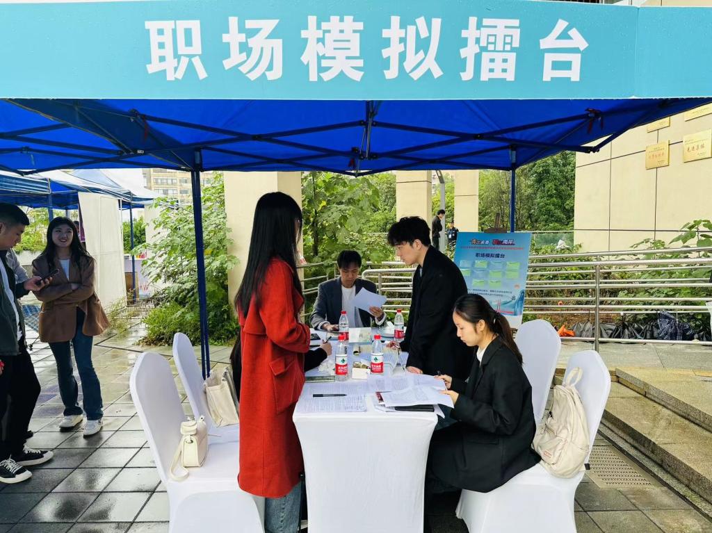 本次招聘会携手重庆市南岸区就业和人才中心举办“青出渝南·职在南岸 2023年南岸区就业服务联盟大学生职场模拟游园”活动。低年级和毕业年级学生积极参加到职场模拟、简历诊断、职业指导等互动活动中。