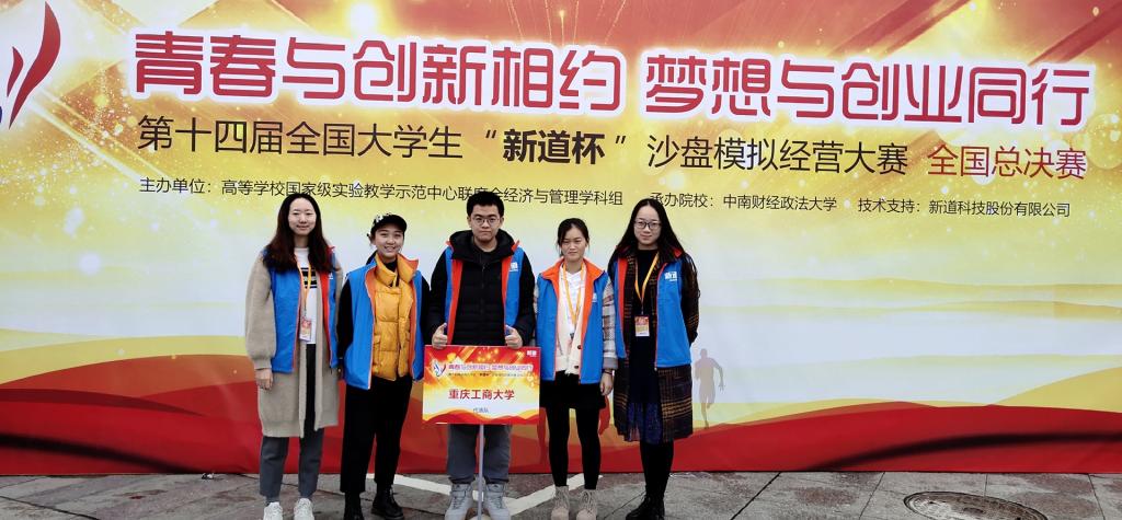 2018年11月10日至11月11日,由高等学校国家级实验教学示范中心联席会经济与管理学科组主办、中南财经政法大学承办、新道科技股份有限公司提供技术支持的第十四届全国大学生“新道杯”沙盘模拟经营大赛全国总决赛在中南财经政法大学隆重举行。重庆工商大学代表队参加了全国总决赛,并荣获三等奖。