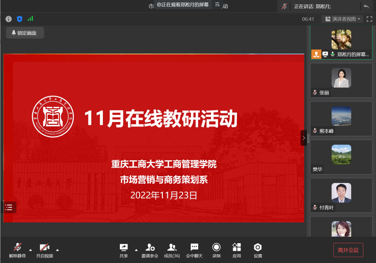 11月23日晚7点,市场营销与商务策划系在企业微信会议平台开展了11月教研活动,除部分有课的老师之外,共有30名老师参与。教研活动由系副主任郑淞月博士主持,其他两位主任同时分享了相关工作进展。