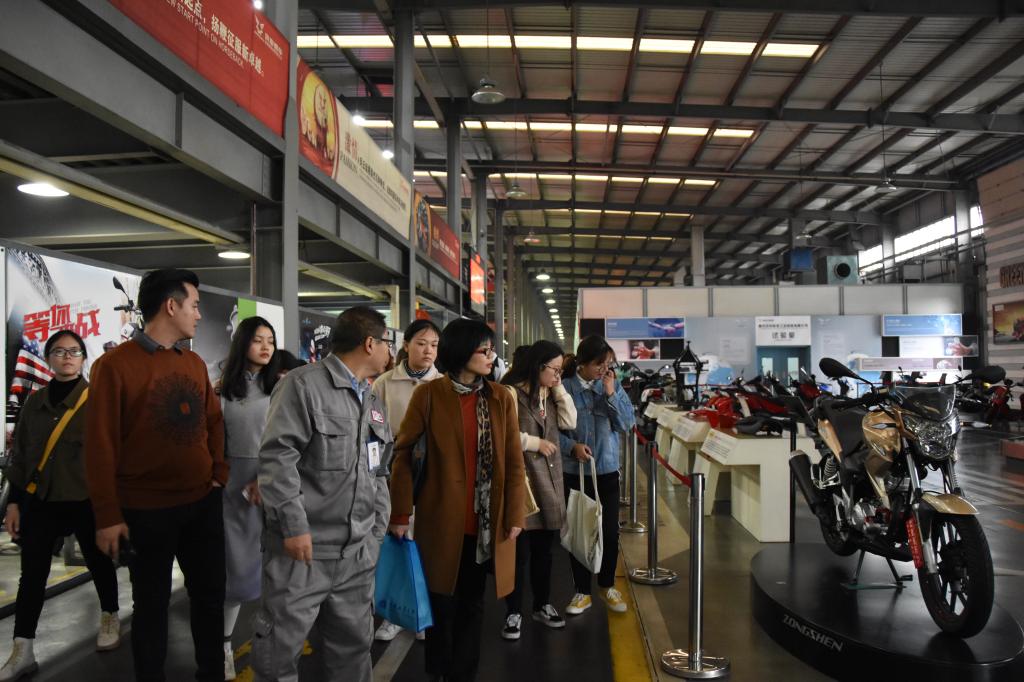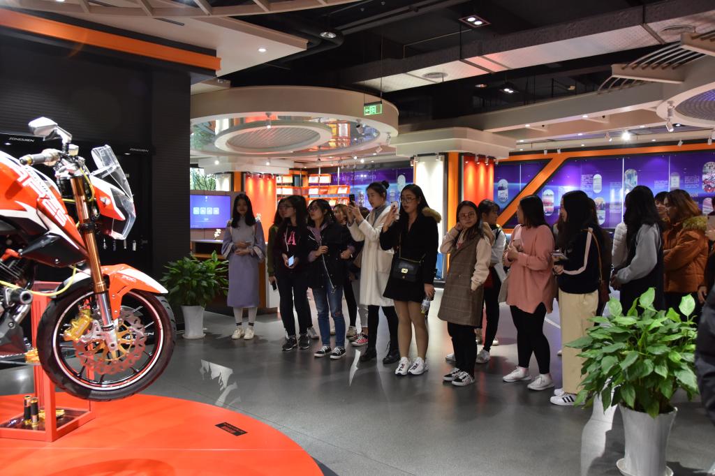 参观完宗申集团的历史馆后,同学们进入了摩托车总装车间,参观摩托车整车组装、检测、包装的全流程,亲身感受生产作业现场的工作氛围和管理规范,也让同学们在课本之外真实接触到企业生产管理模式。