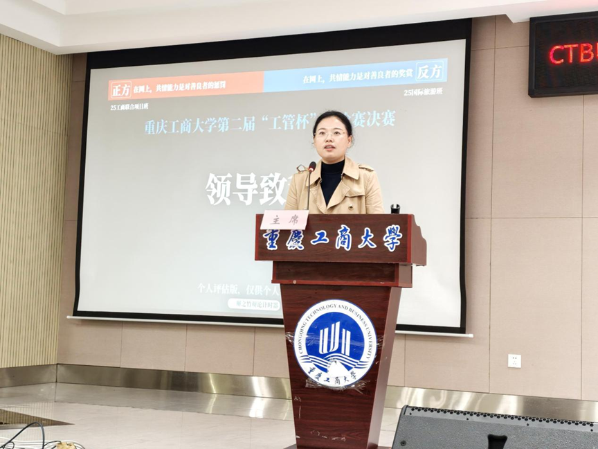 2025年11月14日,122cc太阳集成游戏第二届“工管杯”辩论赛决赛在学生事务中心B101会议室精彩上演。学院党委副书记程亚、学工办主任谭予涵、学生会指导老师边子华莅临现场指导,重庆工商大学校辩论队队长刘星宇、陈林楚涵及校辩论队成员徐梓艺组成专业评委团,共同见证这场思辨盛宴。