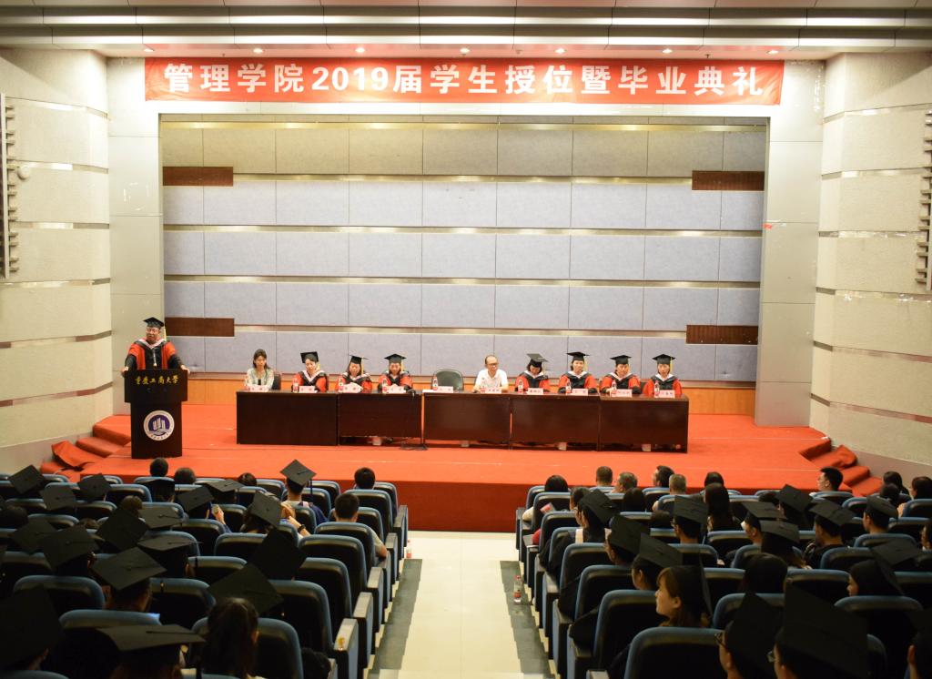 6月24日14:00,管理学院2019届学生毕业典礼暨授位仪式在博智楼7100报告厅如期举行。出席毕业典礼的学院领导有分党委书记、副院长王建明,分党委副书记、院长杨柏,分党委副书记、纪委书记王静,副院长黄钟仪、周莉。管理学院全体教职工也到场共同见证了这一庄严神圣的丰收时刻。学院2019届全体硕士和本科毕业生参加了毕业典礼,本次典礼由副院长周莉教授主持。